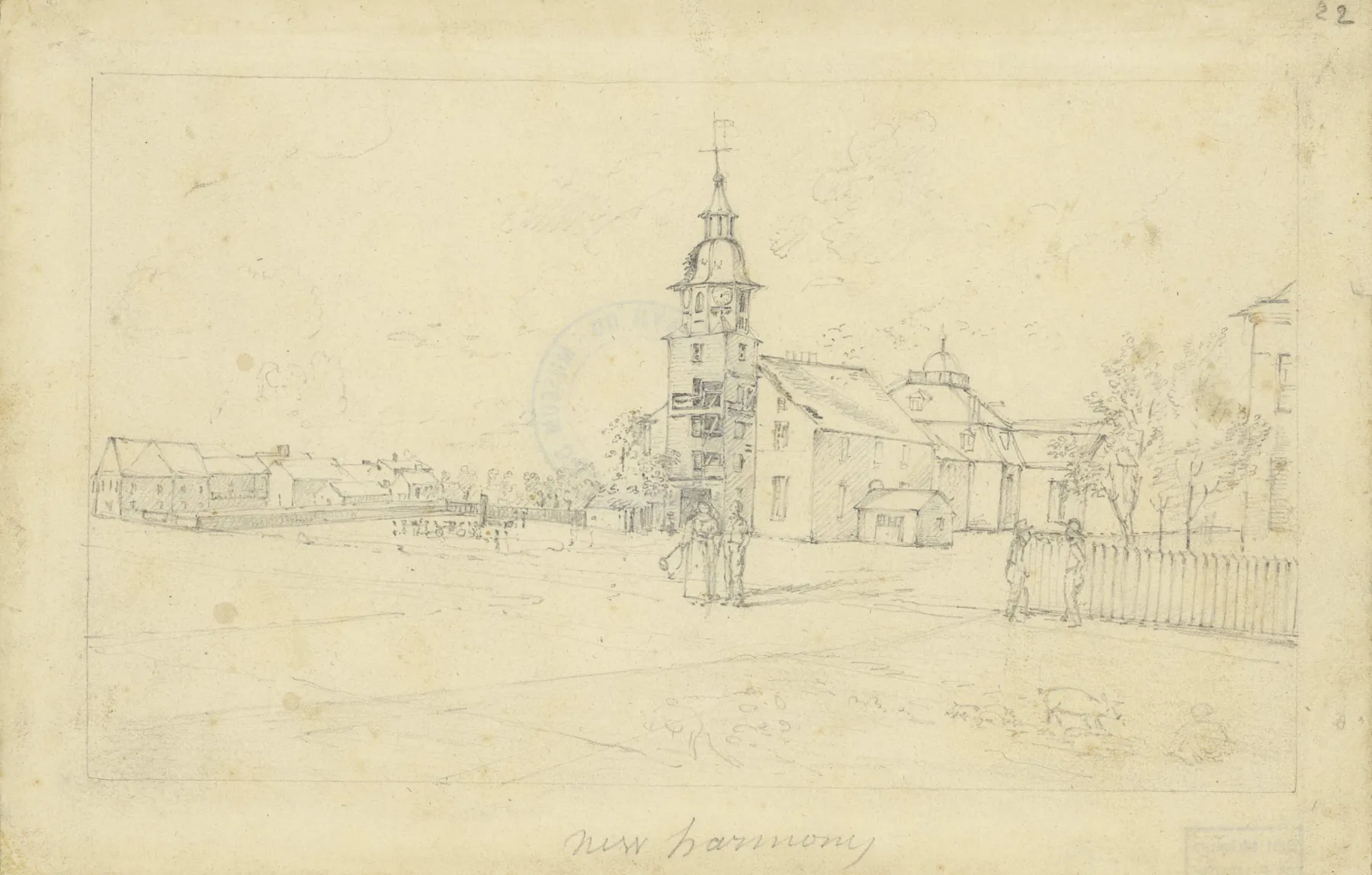 La communauté de New Harmony est fondée en 1814 par George Rapp, puis rachetée par l’industriel écossais Robert Owen. Elle compte près de 600 personnes. Lesueur s’installe dans cette communauté en 1826, introduit par William Maclure, alors principal associé de Robert Owen. Sa tâche sera de constituer des collections d’histoire naturelle destinées à l’apprentissage et l’éducation des plus jeunes.