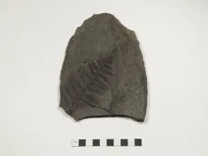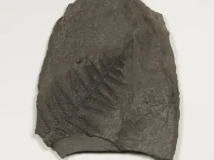Les mines de Charbon du nord de la France sont bien connues mais il existait d’autres zones d’exploitations en France, comme dans l’Hérault d’où provient cette fougère. Afin d’atteindre les couches de charbons, les mineurs extrayaient de grandes quantités de schistes noirs, sans intérêt pour eux, mais parfois fossilifères. Cette fougère provient de ce type d’exploitation. Du genre Pecopteris (du grec –pec, peigne et –pteri, aile), elle date du Carbonifère, soit environ 300 millions d’années. Il s’agissait de fougères arborescentes, avec un tronc qui pouvaient atteindre plusieurs mètres de haut. Ces fossiles végétaux trouvés en abondance nous informent sur le climat chaud et humide qui régnait à l’époque en France. Il faut imaginer l’écosystème du Carbonifère comme une forêt équatoriale chaude et humide peuplée d’arthropodes géants.