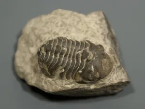 Ce trilobite de la famille des Phacops (du grec –phac, lentille et –ops, vue) possède une tête globuleuse et de grands yeux. Son excellent état de préservation permet d’observer le détail de ses yeux composés d’une multitude de lentilles, lui permettant de profiter d’une bonne vision avec un champ large. Cette variété de trilobite avait la capacité de se rouler en boule afin de se protéger des prédateurs.