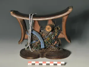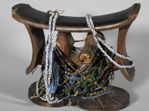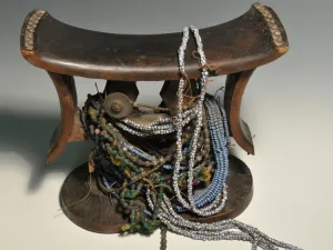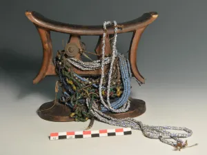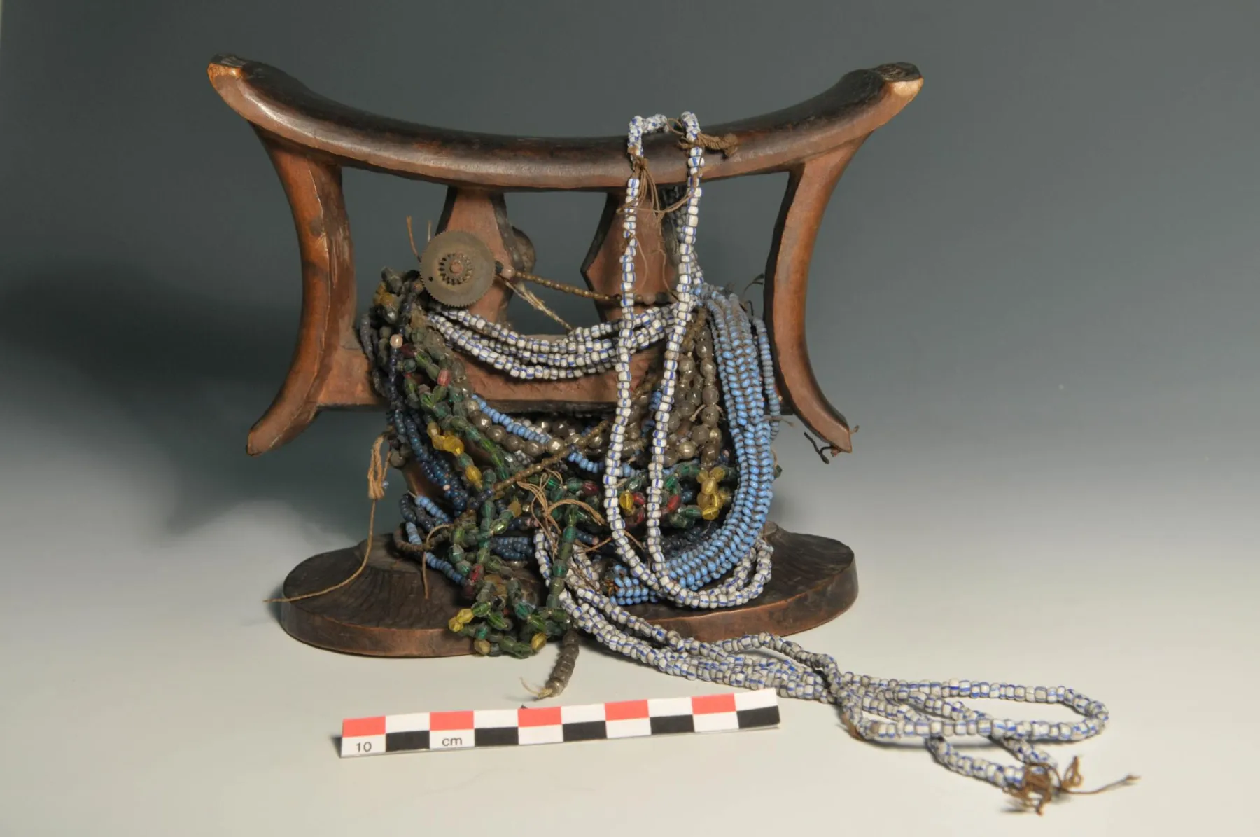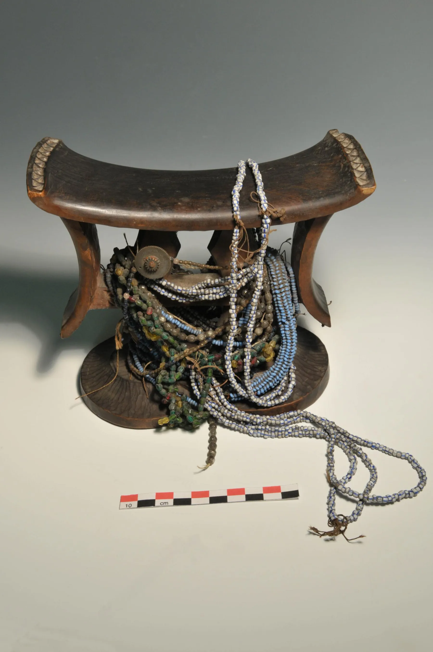 Dans de nombreuses régions d’Afrique, les appui-tête sont destinés à permettre aux hommes de se reposer tout en préservant leurs coiffures. En temps de cérémonies, celles-ci peuvent être particulièrement élaborées, et fragiles. Ces objets sont très personnels, ne se prêtent pas et sont associés aux rêves. Certains appuis-tête portent des ornements comme c'est le cas ici. Ceux-ci sont composés de multiples colliers de perles et d’une ancienne boîte à musique, conférant un caractère extrêmement rare, car ces décorations étaient ordinairement retirées des objets par les collectionneurs européens. Dans certaines ethnies africaines, les hommes portent leur appui-tête au bras dans la journée et se font enterrer avec lui à leur mort.