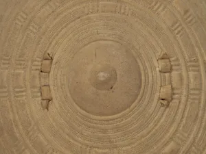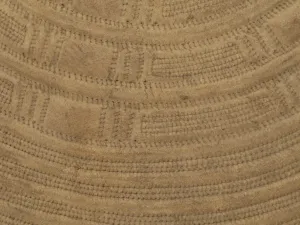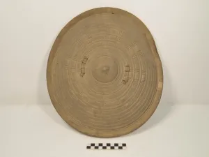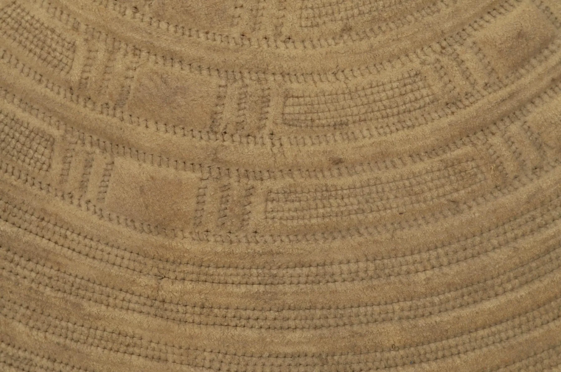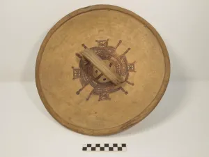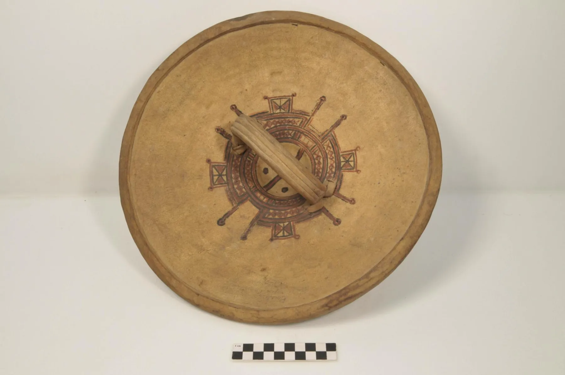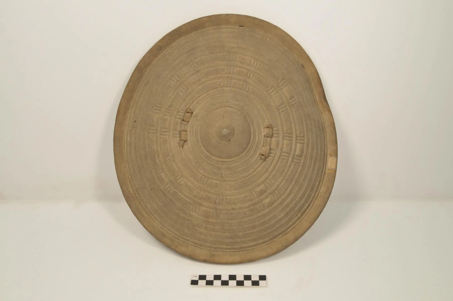 Les Somalis sont considérés par leurs voisins de la corne de l’Afrique comme un peuple particulièrement guerrier et expansionniste. Ils sont également reconnus depuis des siècles pour leur travail du cuir. L’arrondi du centre de leurs boucliers, qui peuvent être faits de cuir d’hippopotame, de rhinocéros, de girafe ou encore d’oryx, est obtenu en pressant la peau de l’animal sur une pierre. Les motifs de cercles concentriques et de lignes sont ensuite gravés sur la peau. La face interne présente parfois, comme sur cet exemplaire, de superbes motifs prophylactiques peints en noir et rouge. En temps de paix, les guerriers portaient ces boucliers attachés sur le haut du bras ou sur l’épaule grâce à une lanière de cuir.