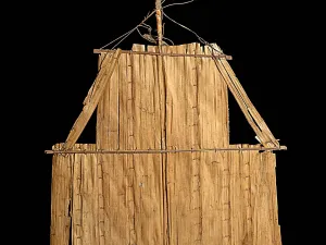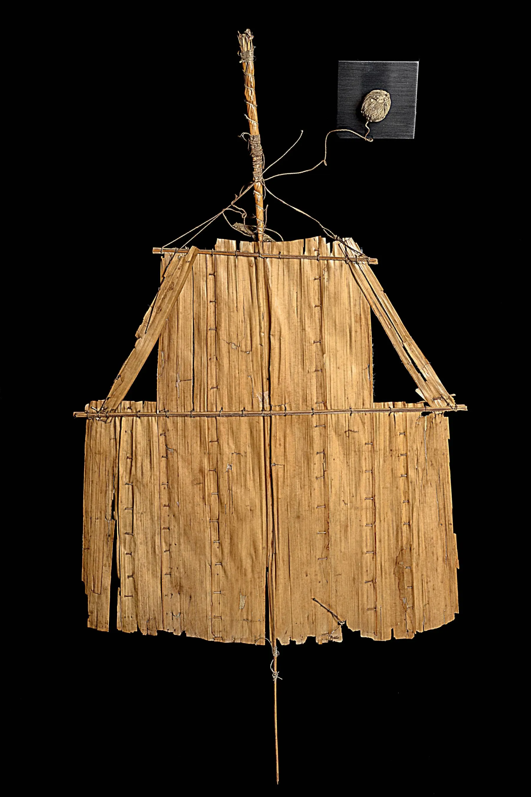Ce cerf-volant était utilisé pour la pêche en pirogue, tenus au bout d’une ficelle par le pêcheur. Un hameçon et un leurre en toile d’araignée y étaient initialement reliés, sautillant à la surface de l’eau selon les déplacements de la pirogue. Particulièrement fragilisé, cet objet a été restauré en 2013.