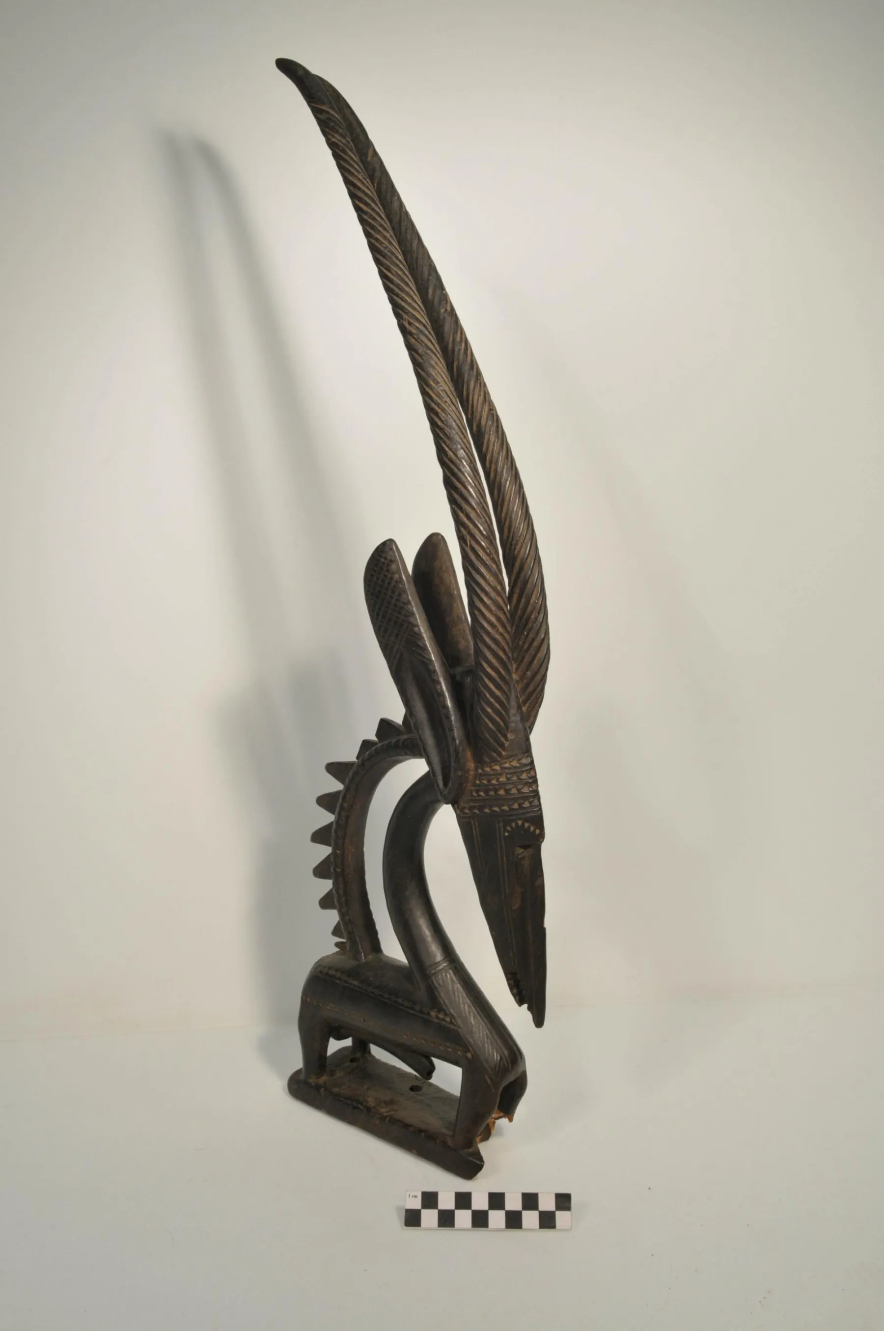 Ces cimiers étaient des objets fédérateurs et protecteurs pour la communauté et sortaient en couple : les mâles, comme celui-ci, ont une crinière, les femelles n’en ont pas et portent un petit sur le dos.