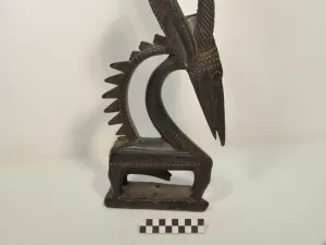 Un cimier est un ornement placé au sommet d'un casque ou ici, d’un bonnet en vannerie. Ce cimier représente une antilope et était porté lors des danses de la société d’initiation Ciwara chez les Bamanas.
