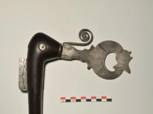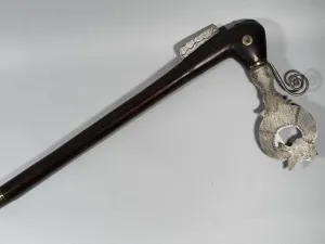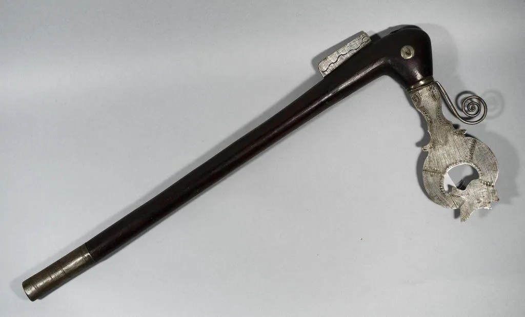 Cette récade présente quant à elle une iconographie et donc une forme de lame rare, celle d’un animal se mordant la queue.