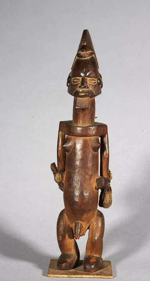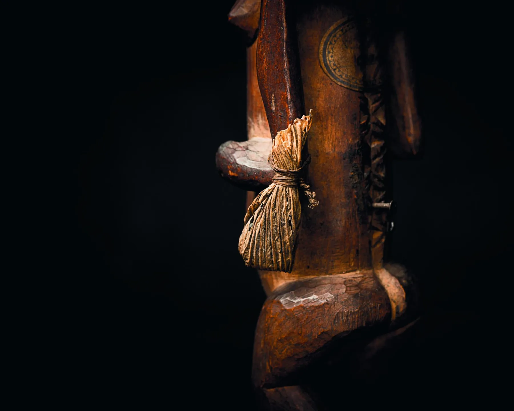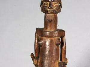 Cette statuette porte deux petites « médecines », charges magiques, accrochées aux coudes. Une fois ces charges activées par le « devin » nganga, la statuette est dotée de pouvoirs de protection individuelle.