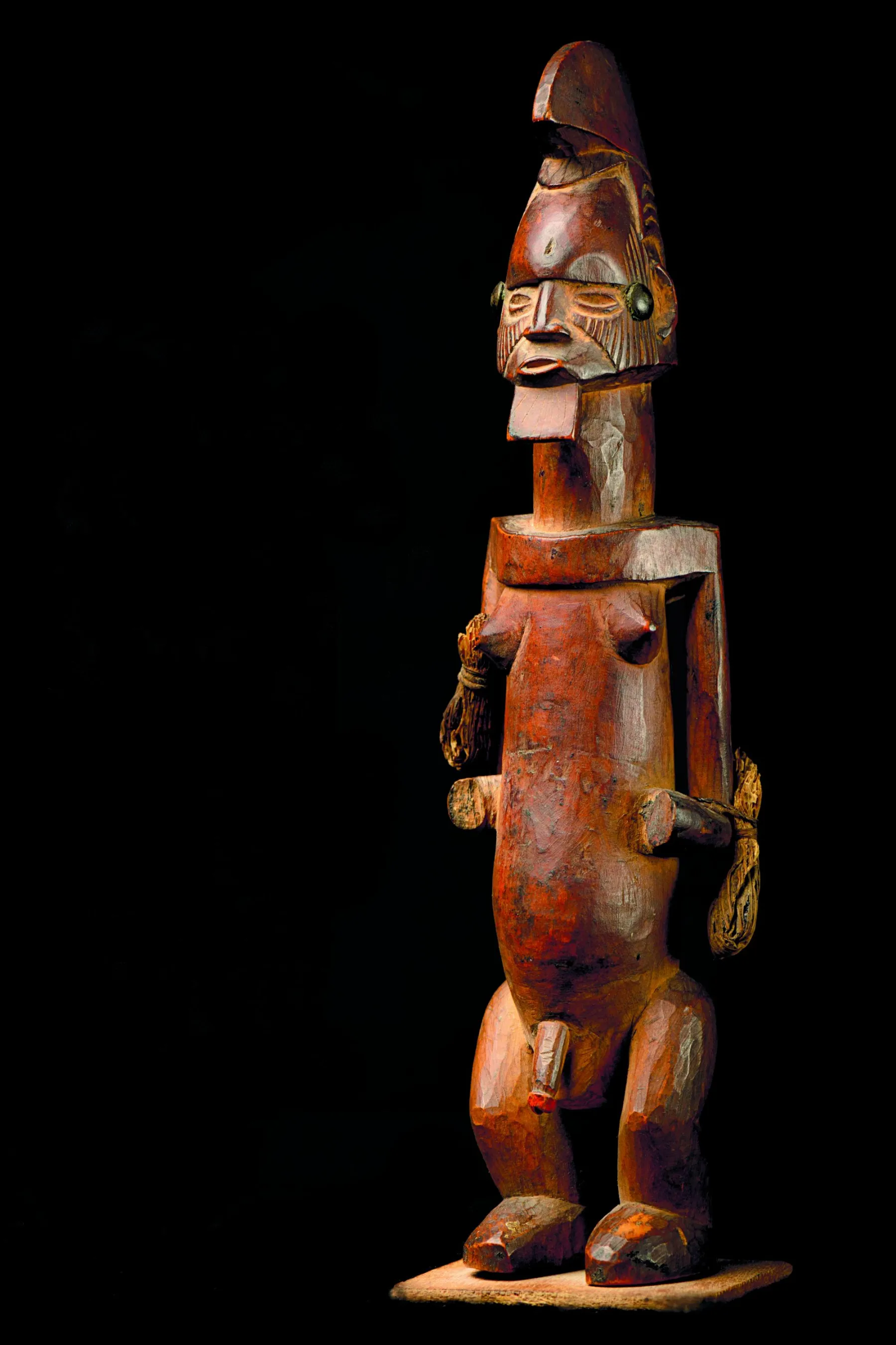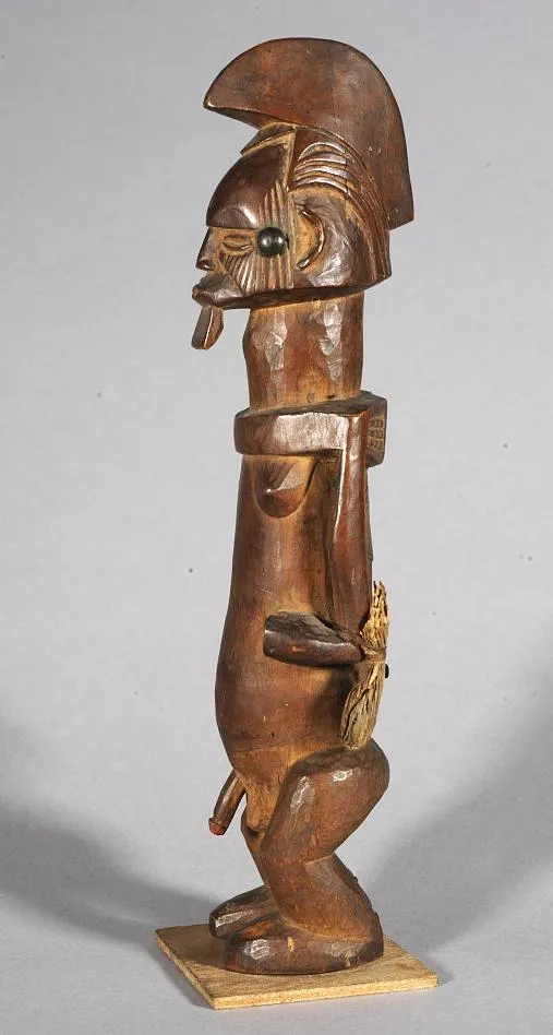 Les statuettes masculines de l’ethnie Teke sont facilement identifiables car elles possèdent des traits constants : jambes fléchies, bras collés à angles droits au corps, visage scarifié, barbe trapézoïdale et coiffure en forme de heaume.