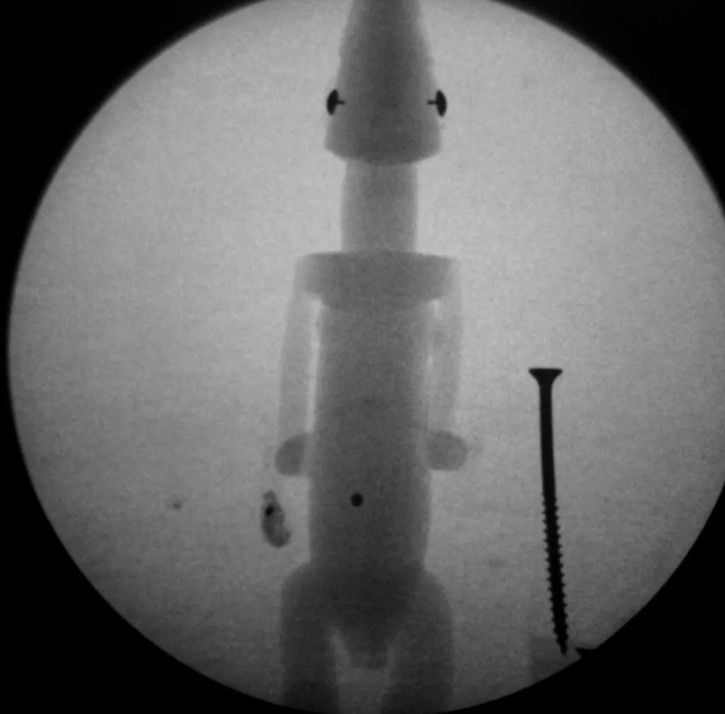 Si la plupart des statuettes Teke, appelées butti, sont engoncées du cou aux pieds dans une gangue de terre contenant des charges magiques, celle-ci possède seulement deux « médecines ». L’une d’entre elles contient une petite bille métallique, aperçue lors de la radiographie.