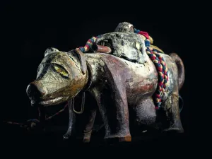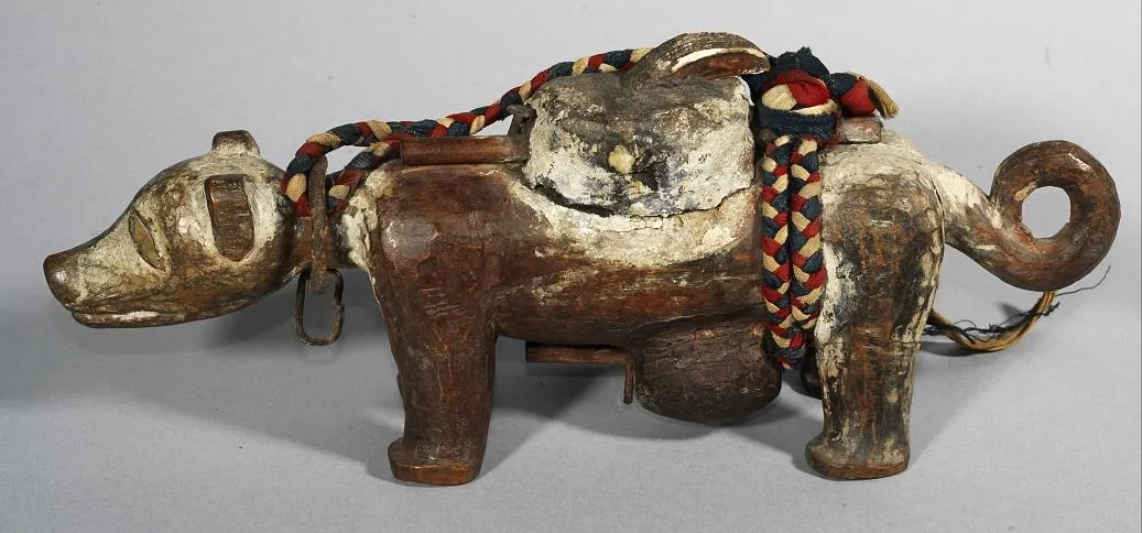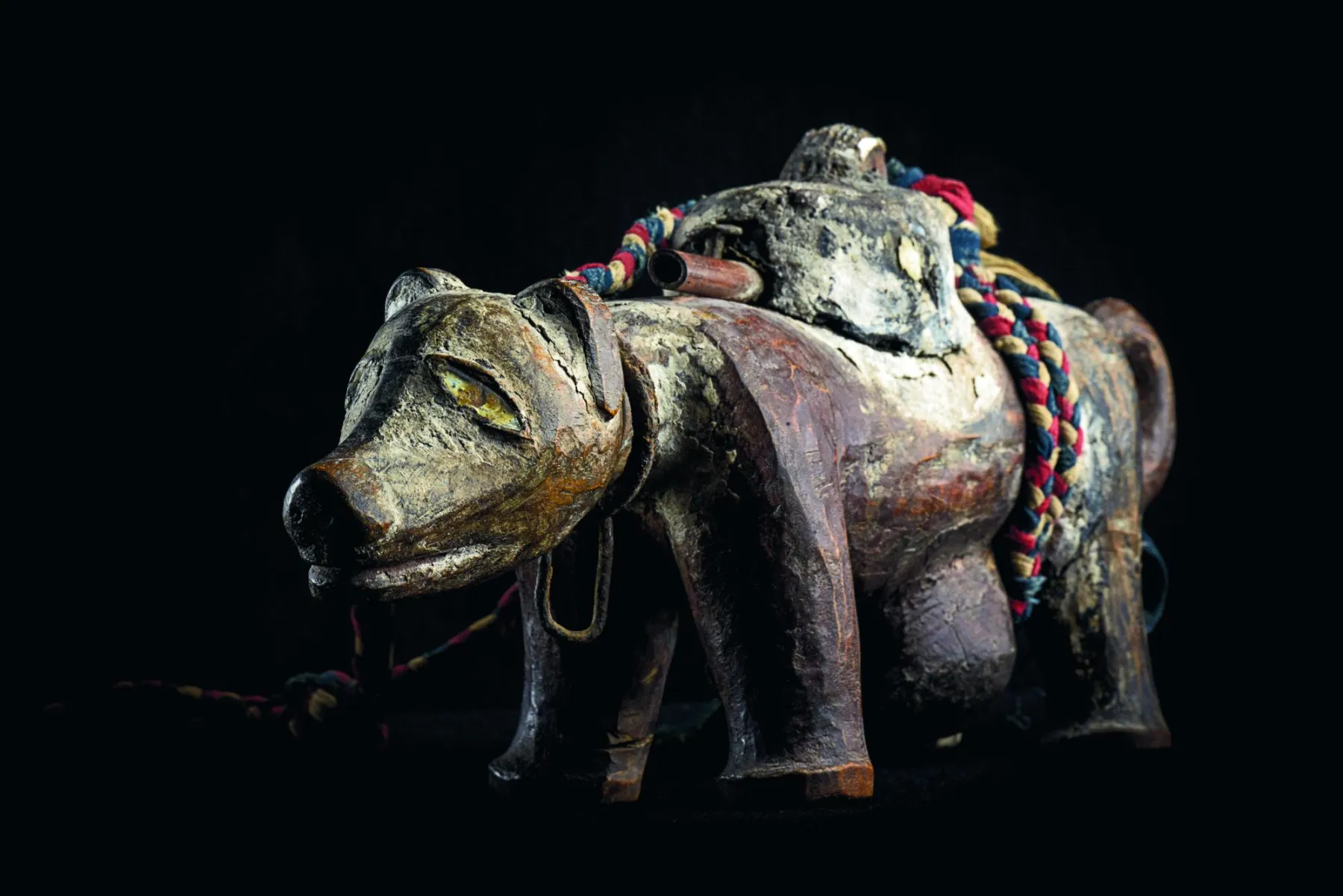 Un chien magique ? Lors de certaines cérémonies, le devin guérisseur introduisait à l’intérieur de cette statuette de chien des charges magiques (dents, graines, poils,…). La statuette devait ainsi permettre à son propriétaire de conserver sa bonne santé et de résoudre ses problèmes.