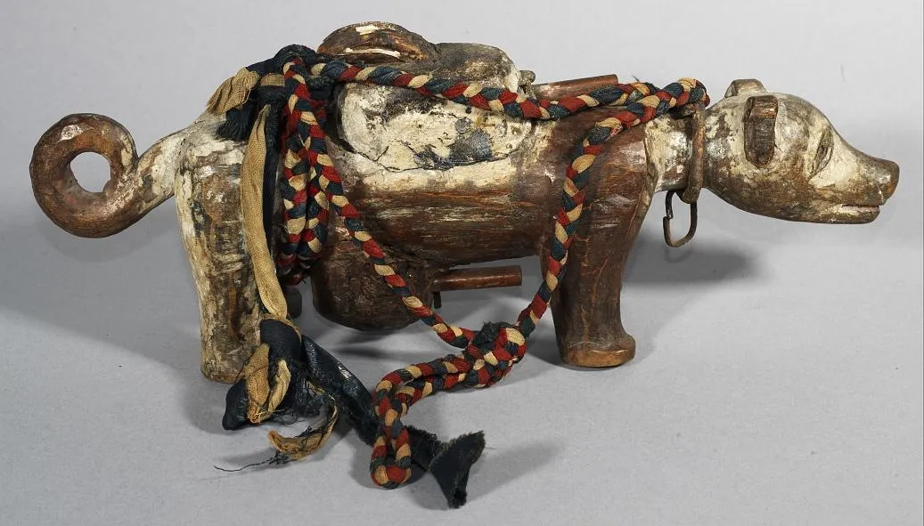 Cette statuette représentant un chien est un nkisi, « fétiche » supposé recéler une grande puissance. Ses cavités abdominale et dorsale contiennent des charges magiques appelées bilongo (métal, graines, poils, dents et divers liants) complétées par des tresses de tissu et un amas d’argile.