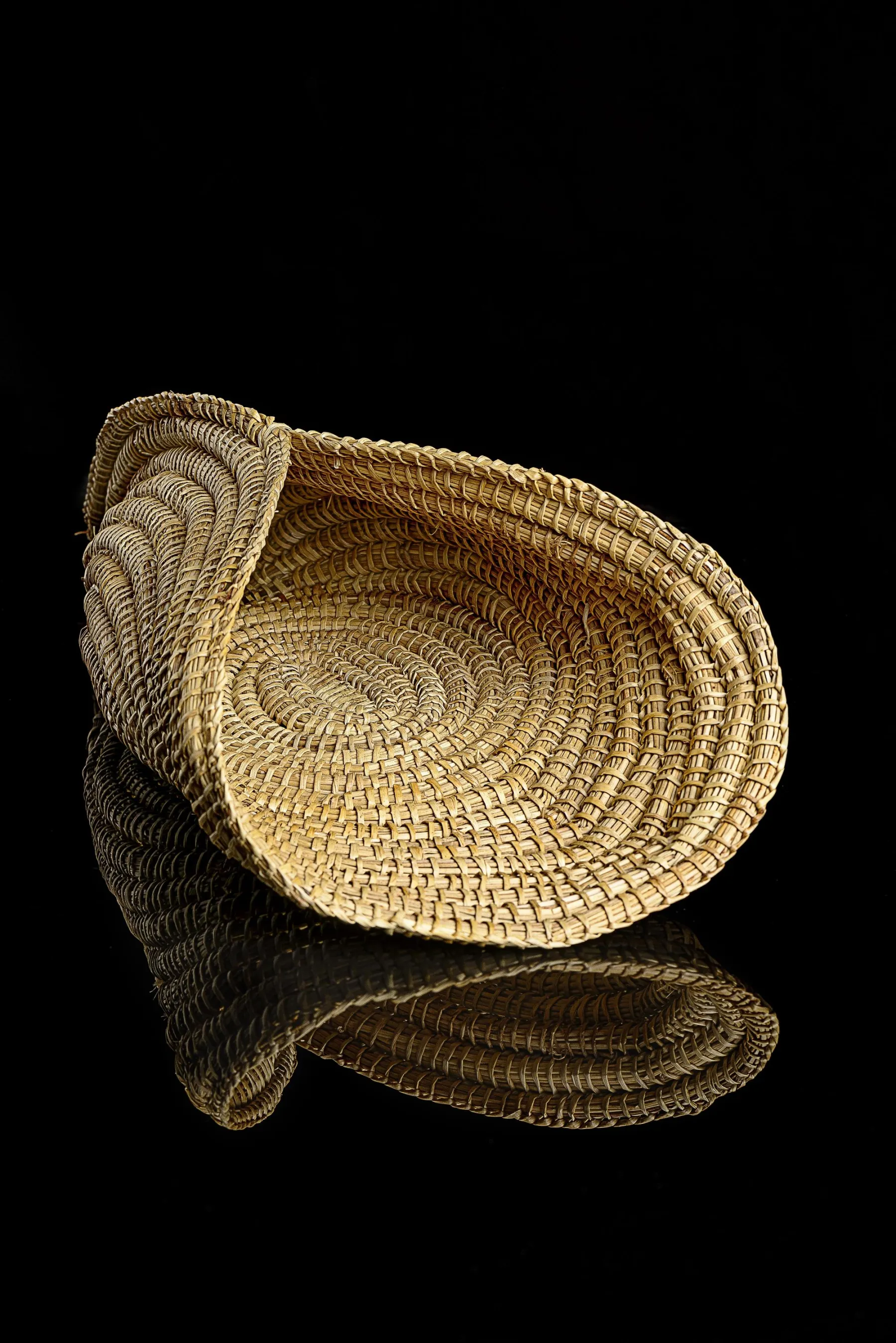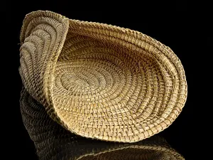 Ce panier à pêche (fish scoops) est réalisé à partir d’une forme ovale. Les bords sont ensuite rabattus et joints l’un à l’autre afin de donner une forme triangulaire avec une ouverture à une extrémité. Ce type de panier était utilisé par les femmes et les enfants pour collecter les petits poissons (sprats et tadpoles). Une fois le panier plein, l’eau pouvait s’évacuer aisément par les fines perforations et le contenu était ensuite versé dans un panier plus large.