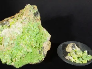 *Minéral secondaire : on qualifie un minéral « primaire » lorsqu’il n’a pas subi les effets d'une altération postérieure à son dépôt. Au voisinage de la surface du sol, au dessus de la nappe phréatique, les phénomènes d'oxydation donnent naissance à des minéraux secondaires. Ici, l’altération de la pechblende donne naissance à l’autunite. (Source : Futura sciences)