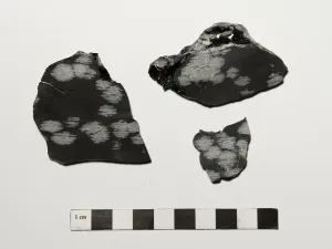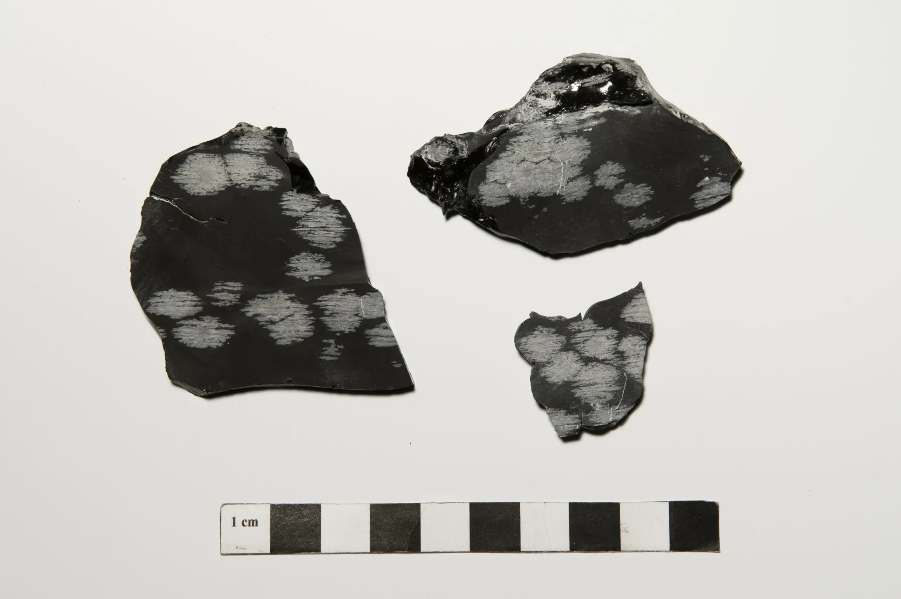 Certaines obsidiennes sont dites à « flocons de neige » car elles contiennent des cristaux blancs rayonnant (cristobalite). Les « larmes d’Apache » sont des petits galets d’obsidienne arrondis lors de leurs transports dans le sable de rivières. L’obsidienne acajou est une variété « rouille » à taches marron ou noires, couleur due à des traces métalliques.
