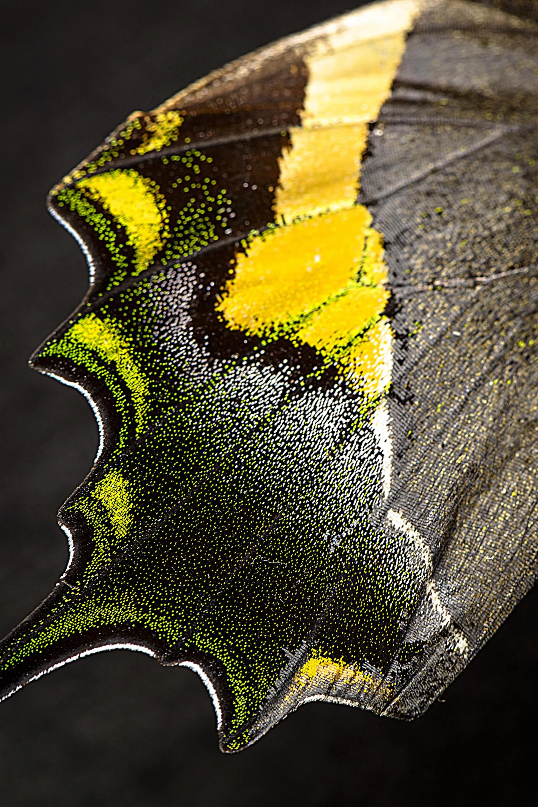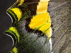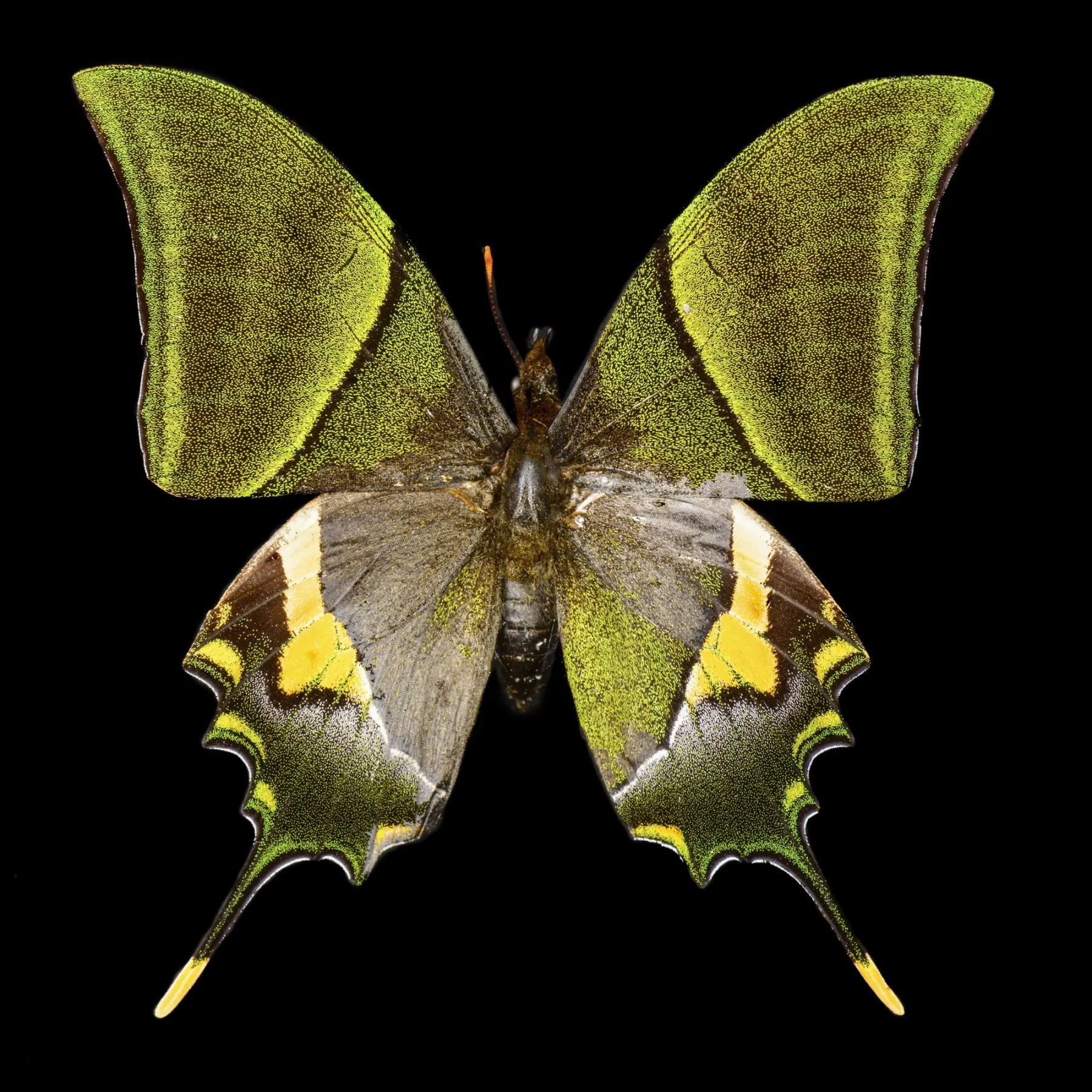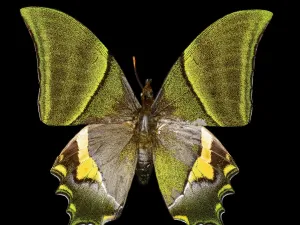 Cette espèce présente également un dimorphisme sexuel, puisque le mâle affiche des couleurs plus vives et davantage de taches jaunes. La femelle est beaucoup plus rare. Plus grande que le mâle, elle possède des ailes beaucoup plus découpées, qui s’étirent en trois prolongements qui rappellent les ramifications des bois de cerf.