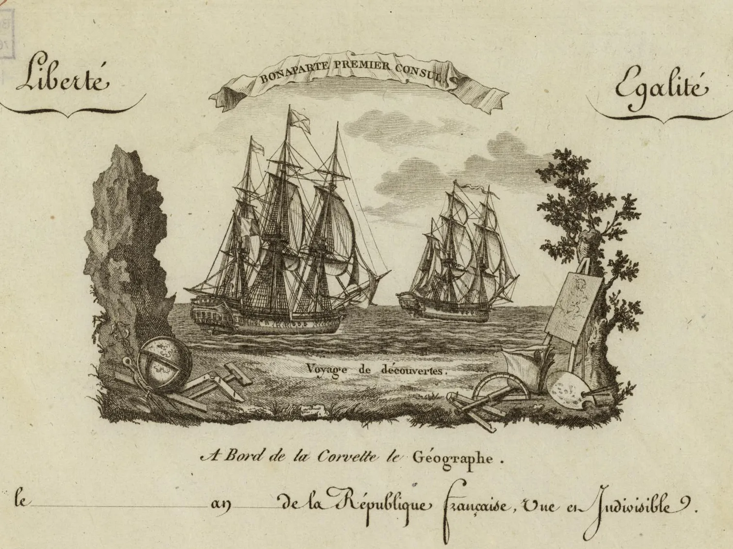 En 1800, deux bateaux quittent le port du Havre en direction de la Nouvelle-Hollande, nom alors donné à l’Australie. Projeté par le capitaine Nicolas Baudin et ordonné par le Premier Consul Bonaparte, le Voyage de Découvertes aux Terres Australes a duré près de quatre années, pendant lesquelles la corvette Le Géographe et la gabare Le Naturaliste ont sillonné les mers du sud.