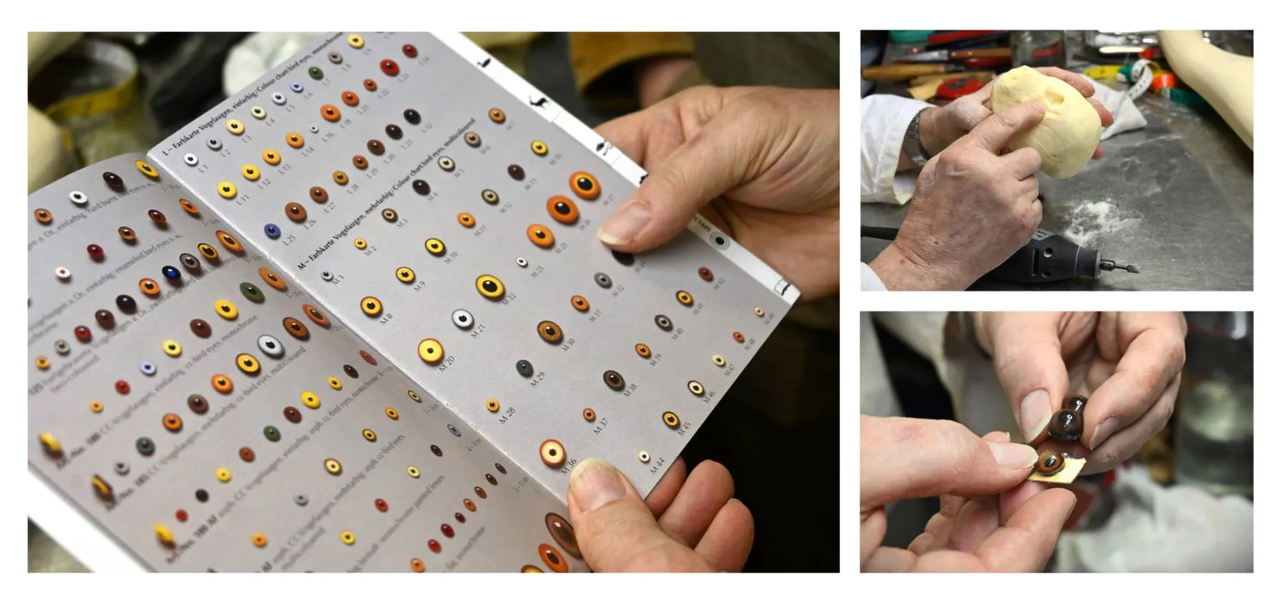 Puis c'est au tour des yeux, j’ai toujours été très exigent car si on ne met pas la bonne couleur, la bonne nuance, le bon diamètre ou le bon aspect, cela peut tout gâcher ! On sélectionne ceux qui se rapprochent le plus de la réalité. Il en existe de toutes sortes ! Des yeux avec des pupilles rondes, ovales, dilatées ou encore fendues…  Les plus réalistes et les plus jolis sont ceux en cristal. Le seul souci est qu’ils coutent très cher puisqu’ils sont fabriqués un à un à la main par des artisans. Chaque détail est peint : iris, reflets, veines...  C’est beaucoup de travail et de technique !  Ces artisans travaillent d'ailleurs à l’envers : ils peignent avec l’œil creux face à eux et mettent un miroir de l'autre côté pour voir le rendu en temps réel.