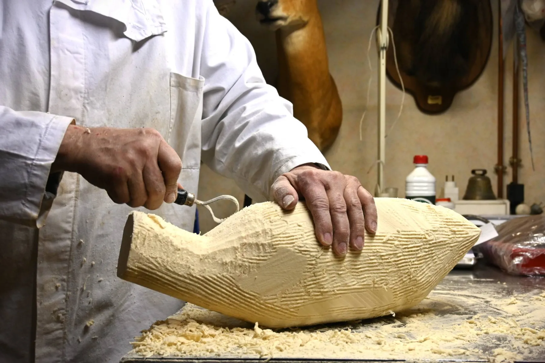 Une fois les mesures faites et pendant que le cuir travaille, je réalise ensuite le mannequin. Pour ma part, j’utilise de la mousse polyuréthane. Cette matière est plus résistante et plus facile à travailler que les anciennes structures faites de bois et de paille. Comme un sculpteur, on sculpte le corps de l’animal directement dans la matière, qu’on peut scier, tailler, modeler…