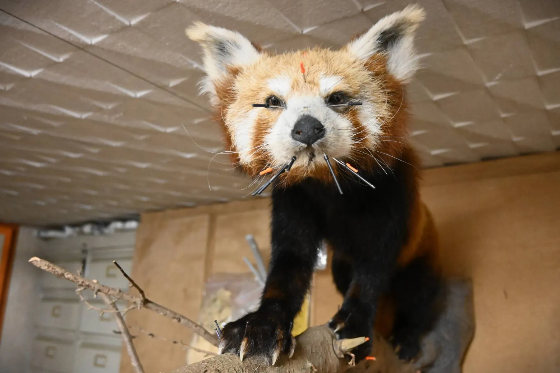 Enfin, la dernière étape : les finitions ! On fixe l'animal sur son support et on lui redonne les teintes naturelles qui auraient disparues. En l’occurrence pour le panda, je l'ai fixé sur une branche de Cèdre de l'Himalaya récupérée à l'arboretum de Montgeon. Quant à sa fourrure, celle-ci a été dégraissée et soufflée pour lui redonner un peu de brillance et de volume.