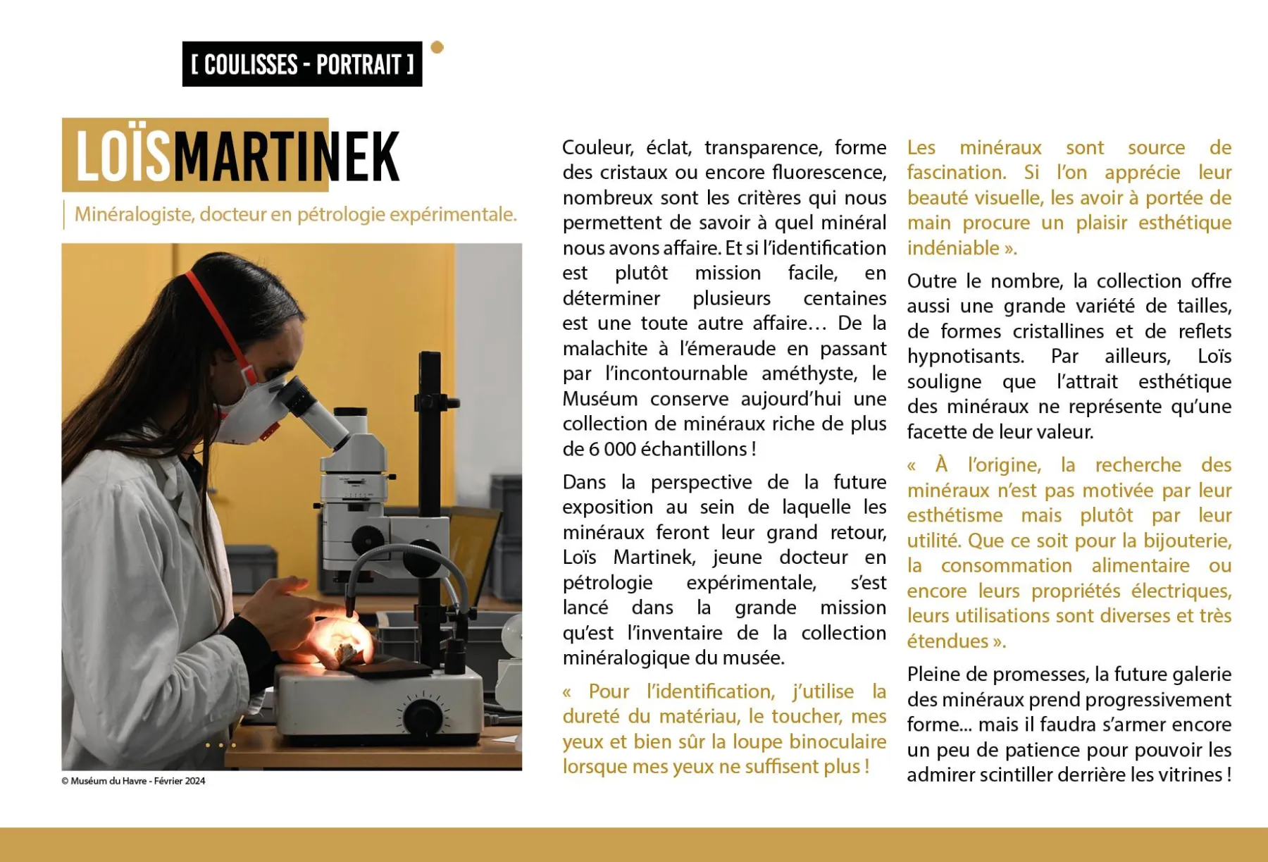 L.M. : Je ne dispose pas d’informations précises sur les spécimens qui seront inclus dans le futur parcours permanent. Mais, il est essentiel de les présenter aux publics. La minéralogie est une science fascinante. Je pense qu’il est bien utile de la comprendre tant les minéraux sont omniprésents dans notre environnement !
