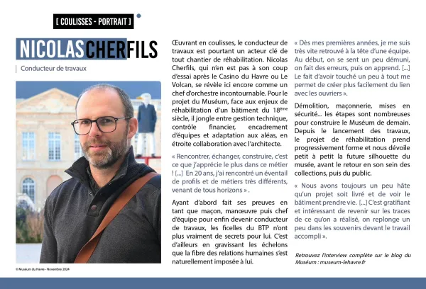 Cléa Hameury (Muséum du Havre) : Bonjour Nicolas, vous êtes conducteur de travaux au sein de l’entreprise Gagneraud Construction et vous êtes missionné sur le chantier de réhabilitation du Muséum. Pouvez-vous nous parler un peu de votre métier ?