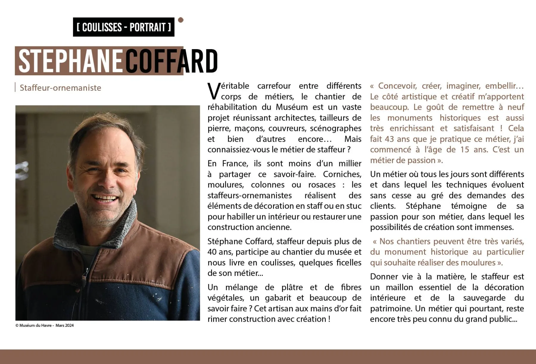 Stéphane Coffard : Je travaille pour la société Art Staff, une entreprise familiale presque centenaire et spécialisée dans le plâtre et… le staff ! Notre entreprise étant Rouennaise, nous intervenons majoritairement sur Rouen mais il nous arrive de nous déplacer ailleurs sur d’autres chantiers, comme c’est le cas aujourd’hui au Muséum du Havre.