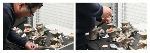 Par exemple, lorsque vous vous trouvez devant un spécimen dont il ne reste plus que quelques vertèbres comme ici, la question que l’on doit se poser est « Quel est le maximum que je peux en tirer ? » et au contraire « Qu’est-ce ce que je ne peux pas en tirer ? ».