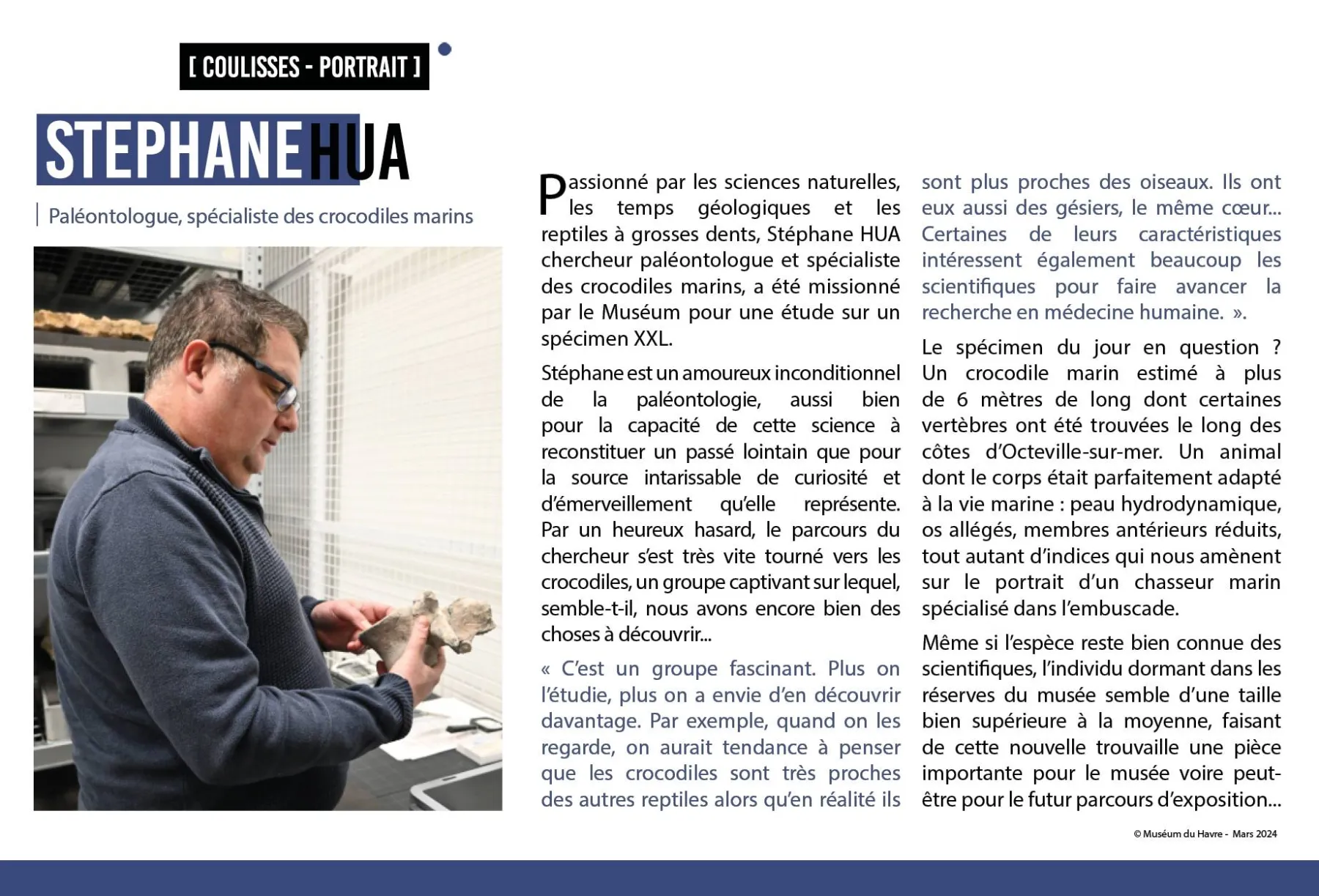 Stéphane Hua est paléontologue spécialiste des crocodiles marins. Titulaire d’un doctorat en paléontologie et informaticien de métier, il consacre son temps libre à la recherche. Cet amoureux des « gros prédateurs à grandes dents » nous dévoile le travail d’enquête qu’il mène actuellement sur un spécimen étonnant récemment découvert et conservé dans les collections du Muséum…