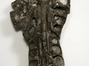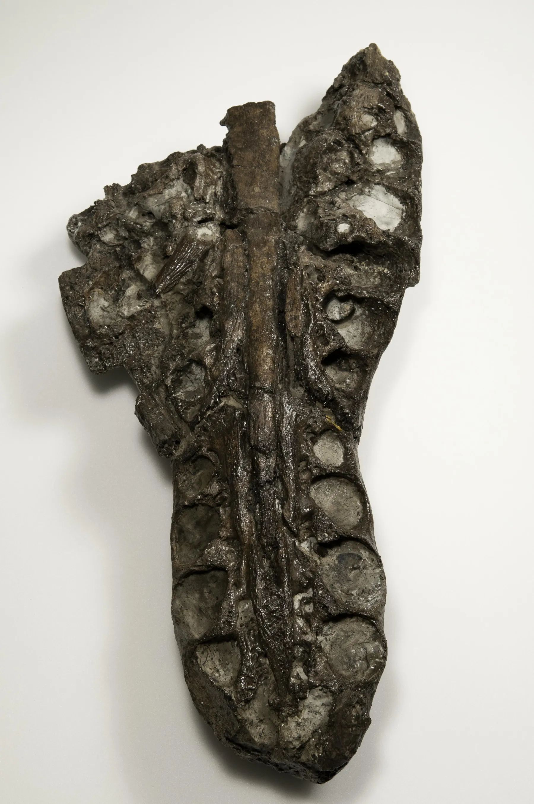 Le crâne d’1m30 de long, aplati par la fossilisation, est presque complet avec sa mâchoire inférieure. Il s’agit des ossements d’un pliosaure (du grec plio « nageoire » et sauros « lézard ») qui vivait dans la mer kimmeridgienne, il y a 145 millions d’années.